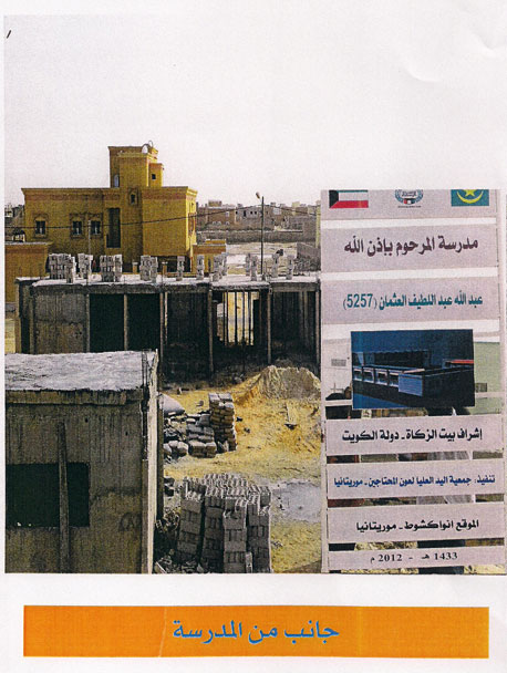 و تبلغ تكلفة المشروع 51,653 د.ك شاملة البناء و الفرش و تجهيز المبنى. و يقوم على تنفيذ المشروع جمعية اليد العليا لعون المحتاجين و رعاية الأطفال في موريتانيا و ذلك تحت الإشراف المباشر لمؤسسة بيت الزكاة في الكويت التي تتولى مهمة الإشراف على كافة المشاريع الخيرية لثلث المرحوم عبدالله عبداللطيف العثمان خارج دولة الكويت. و قد أرسل بيت الزكاة تقريره الدوري الخاص بمتابعة تنفيذ أعمال المشروع و التي توضح بالصور الانتهاء من بناء الدور الأرضي لمبنى المدرسة و التجهيز لأعمال المساح و التشطيبات الأولية.